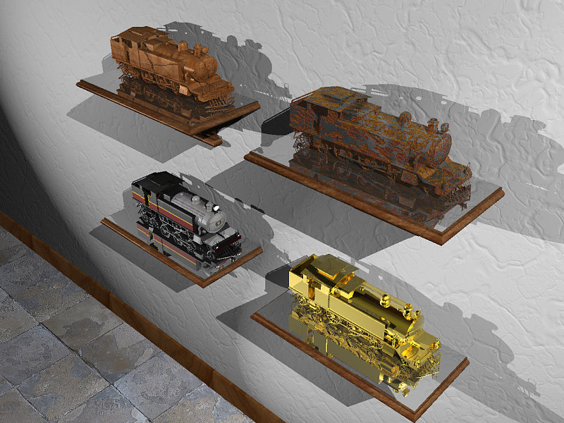 Mein neues Lokomotiven Modell mit verschidenen Texturen. Das Bild wurde in Bryce 5 erstellt. Das Modell ist als Obj. Datei importiert und kann in meinem Shop erworben werden. |