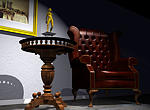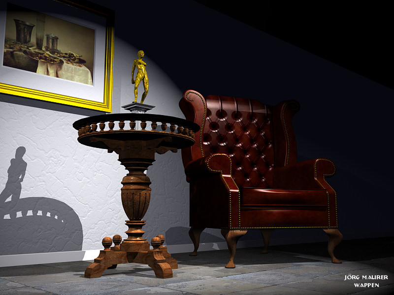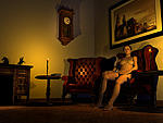 Ein Bild mit meinen neu in Carrara erstellten Modellen (Uhr und Ledersessel). Bei dem Licht habe ich darauf geachtet, das alles nur von den beiden Kerzen ausgeht. |