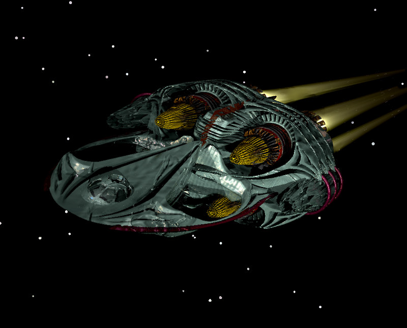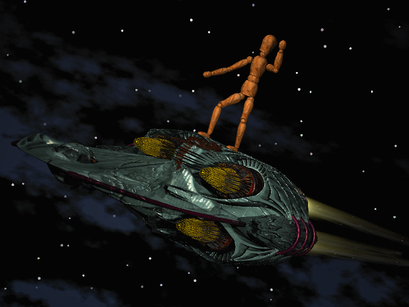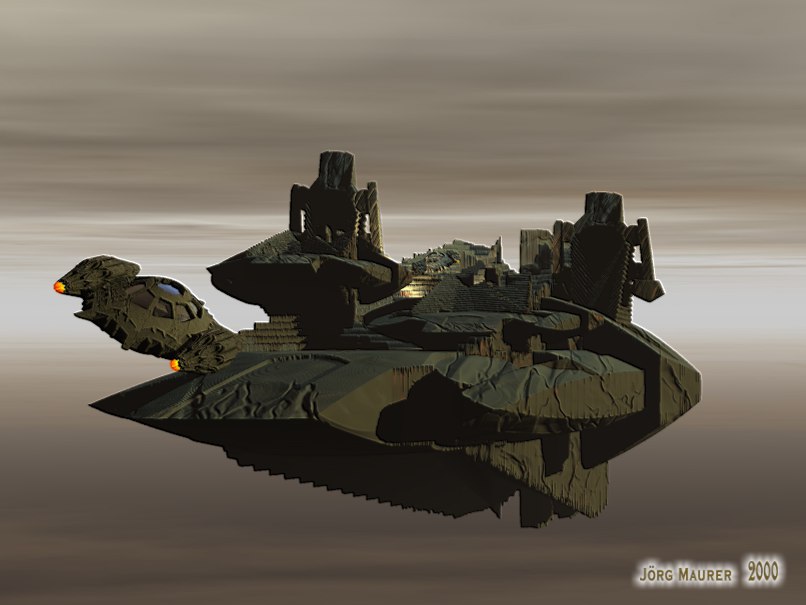 Hier können sie mein erstes aus Terrains modelliertes Raumschiff sehen. Können Sie den Spruch auf der Seite entziffern?. Der Erste, der mir eine Mail mit der Antwort sendet, gewinnt eine meiner gotischen Kathedralen.(16.10.2001)